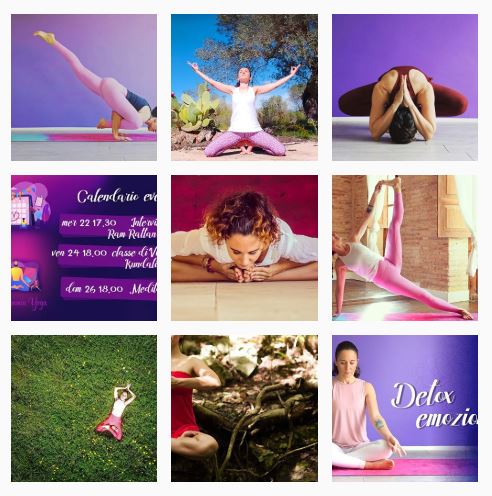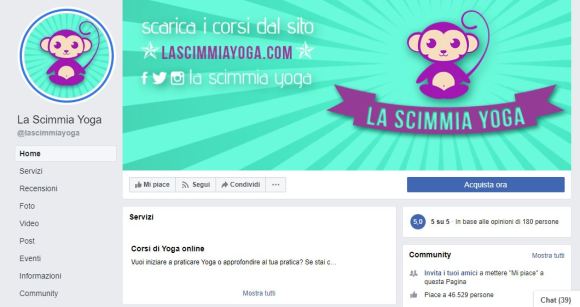 Questi invece sono i profili social di La scimmia yoga. Noti qualche differenza con la pizzeria? Qui si vedono i colori predominanti che sono verde e viola, lo stile delle foto è riconoscibile e usa sempre gli stessi caratteri.