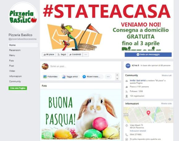Questa è la pagina Facebook della pizzeria basilico, che magari fa pure una pizza buonissima ma manca un pò di cura d’immagine: è tutto un pò a casaccio. Font diversi, immagini a fumetti di stili diversi, i colori delle scritte sono effettivamente uguali ma poi c’è un coniglio pasquale puffoso e multicolor che mi stona anche i colori.